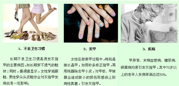 健康的指甲不易受感染。感染真菌的趋向可能与遗传、糖尿病局部动静脉 循环和淋巴回流障碍、周围神经性疾病等因素有关。在潮湿环境作业及经常受外伤的指趾甲容易被真菌感染。灰趾甲大多由足癣直接传播,而灰指甲则可能从手癣传播或由经常抓足而感染,脚指头上的灰指甲比手指更为多见。