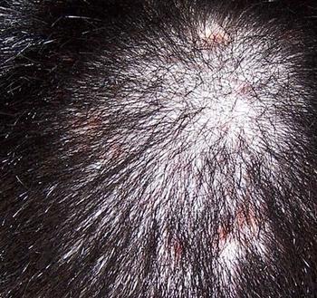 初发时常为散在性,形状如同米粒大小,呈鲜红色或深红色毛囊性丘疹,其中心贯穿毛发,周缘有炎性红晕,随后迅速变成脓疱,但不互相融合。脓疱破裂或拔去其中毛发时可排出少量脓液和血浆,但局部炎症逐渐消退后不留疤痕。