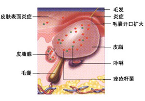 毛囊内正常寄生痤疮丙酸痤疮杆菌(PA),糠秕孢子菌及表皮葡萄球菌等,当游离的脂肪酸增多,丙酸痤疮杆菌不能产生足量的酶分解皮脂,淤滞的脂肪酸使毛囊周围产生非特异性炎症反应。丙酸痤疮杆菌还可分泌低分子多肽,吸引中性粒细胞进入毛囊,导致其水解酶释放,使毛囊上皮渗漏破裂,导致毛囊内容物进入周围真皮组织,造成了从单纯炎症到丘疹、脓肿、结节、囊肿的一系列临床表现。