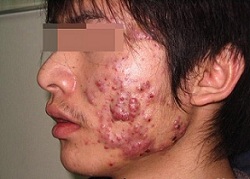 8、聚合性痤疮:数个痤疮结节在深部聚集融合,有红肿颜色青紫,称为融合性痤疮或聚合性痤疮。